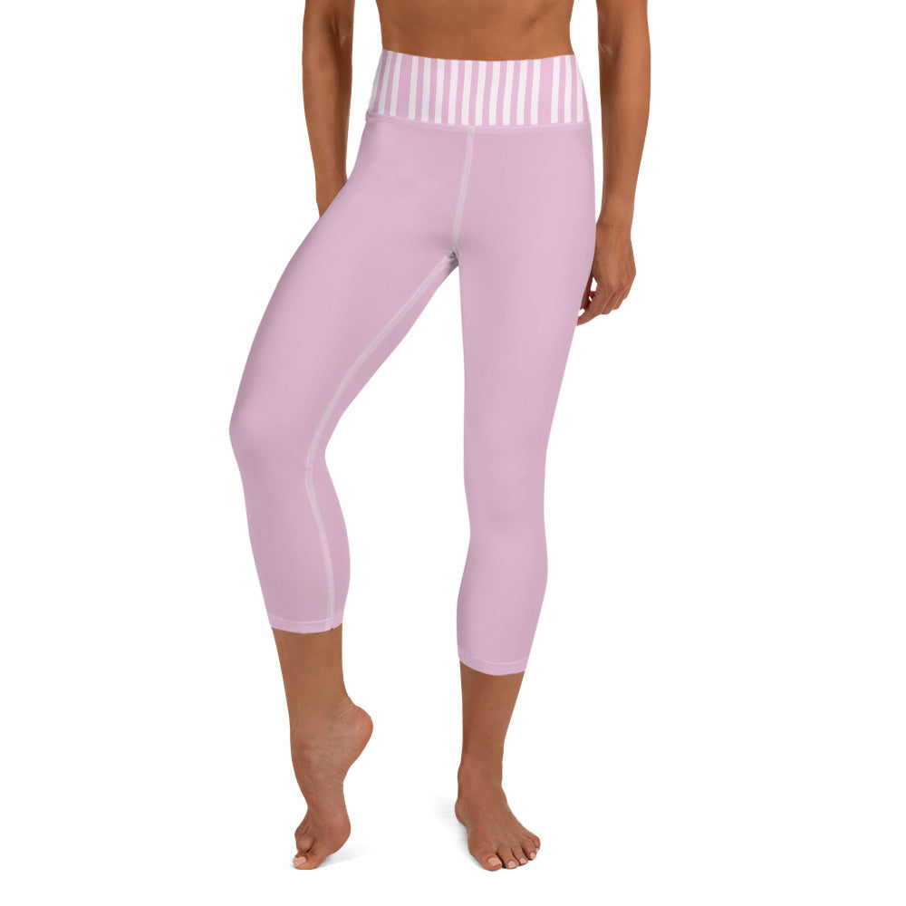 These Savannahwood lavender yoga capri leggings with a high, elastic with a lavender and white waistband are the perfect choice for yoga, the gym, or simply a comfortable evening at home. Enjoy these lavender stripe.